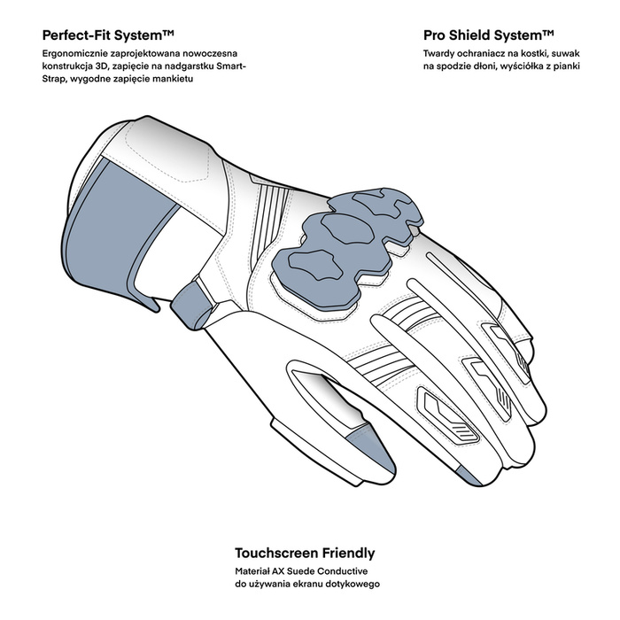 - Wzmocnienia na spodzie dłoni i materiał antypoślizgowy dla lepszego uchwytu